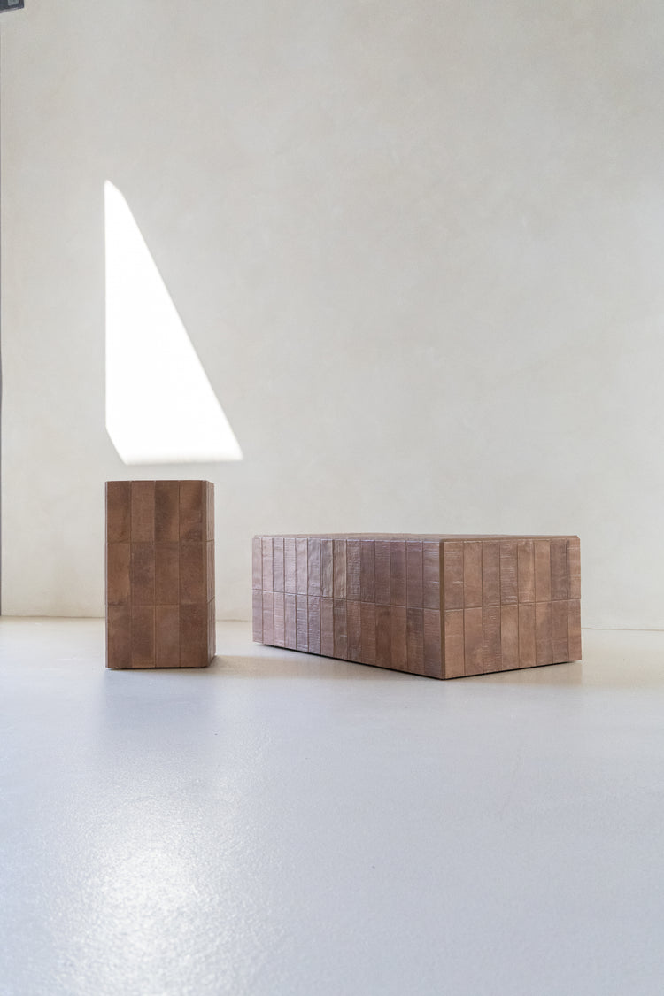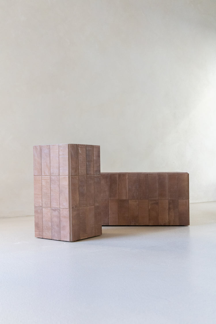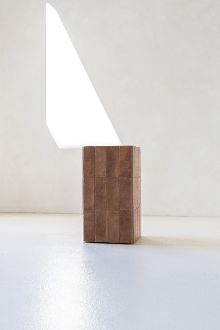 Handcrafted from carefully selected tiles with a smooth Cerano rendered top, this plinth effortlessly blends form and function. Available in a burnt sienna tile finish - it adds a unique touch to any space. Perfect as a side table or a bold standalone statement piece.
